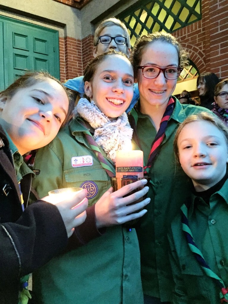 Lors du week-end de Noël, le dimanche en fin d’après midi, quelques éclaireurs et éclaireuses ainsi qu’un louveteau de notre groupe se sont rendus à l’église Sainte-Thérèse à Nantes pour partager la Lumière de la paix de Bethléem avec les Scouts et Guides de France (catholiques). Ce fut un moment fort de partage interconfessionnel. C’est dans cette bonne ambiance que les jeunes et les moins jeunes ont participé à la cérémonie des lumières, symbole de paix et de fraternité à l’heure où nous en avons le plus besoin. Cette fraternité s’est aussi retrouvée dans l’intervention de l’imam de Nantes venu partager cette lumière avec nous. Mais le plus important est que cet esprit, l’esprit de la lumière de Bethléem reste en nous et rayonne de paix. À leur retour, les éclaireurs ont partagé cette lumière avec les paroissiens et leurs familles.