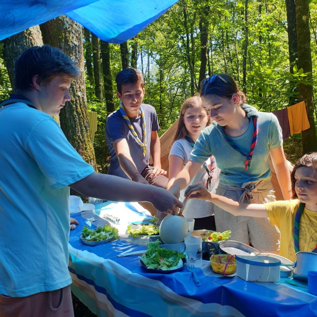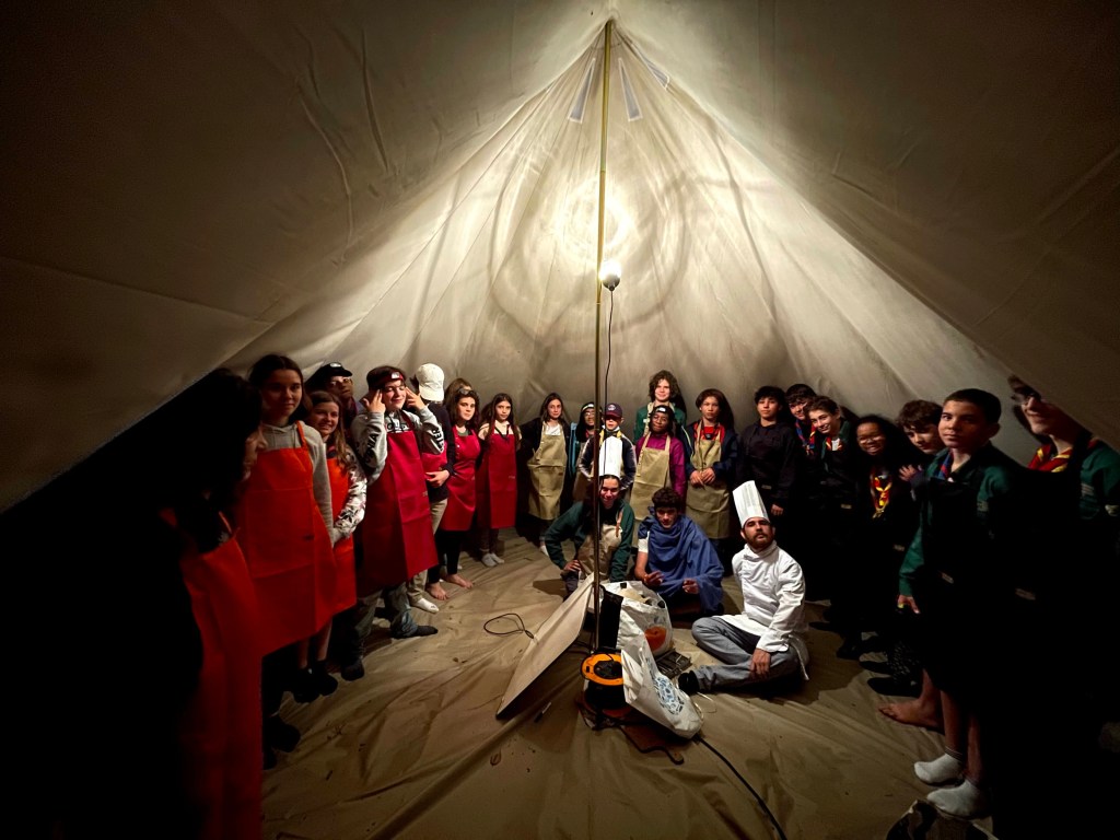 Les éclaireurs et éclaireuses avaient choisi un camp sur le thème de « Top chef ». Ils ont été servis, avec des défis culinaires plus ou moins réussis : on notera le concours de mouillette géante, et des chefs pas très sérieux qui se sont enguirlandsé sur la recette de la carbonara lors d’un grand jeux ! Le camp a néanmoins vu l’aboutissement d’un projet au long cours : un livre de recette regroupant les idées de nos petits mitrons.