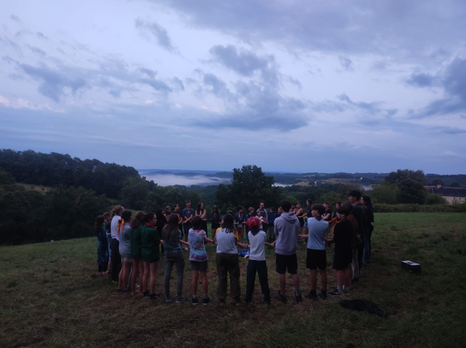 Du côté de la branche cadette, l’un moments les plus drôles a été les olympiades aquatiques : bataille de bombes à eau, catch sur bâche savonnée et douche géante au jet d’eau ont rafraîchi tout le monde dans un éclat de rire général. Plus zen, mais tout aussi appréciés, les « temps massages » improvisés lors des temps libres ont permis aux enfants de démontrer leurs talents en la matière, avec en prime la création d’une « chaîne de massage » qui a rencontré un franc succès. Enfin, impossible de ne pas évoquer ce moment magique : l’ensemble du groupe entonnant pour la première fois depuis longtemps (voire pour la toute première fois ?) un cantique vespéral à 60 voix, face à une vue imprenable sur la vallée de la Laurence. Sous les étoiles, cet instant de partage s’est durablement gravé dans la mémoire de chacun·e.
